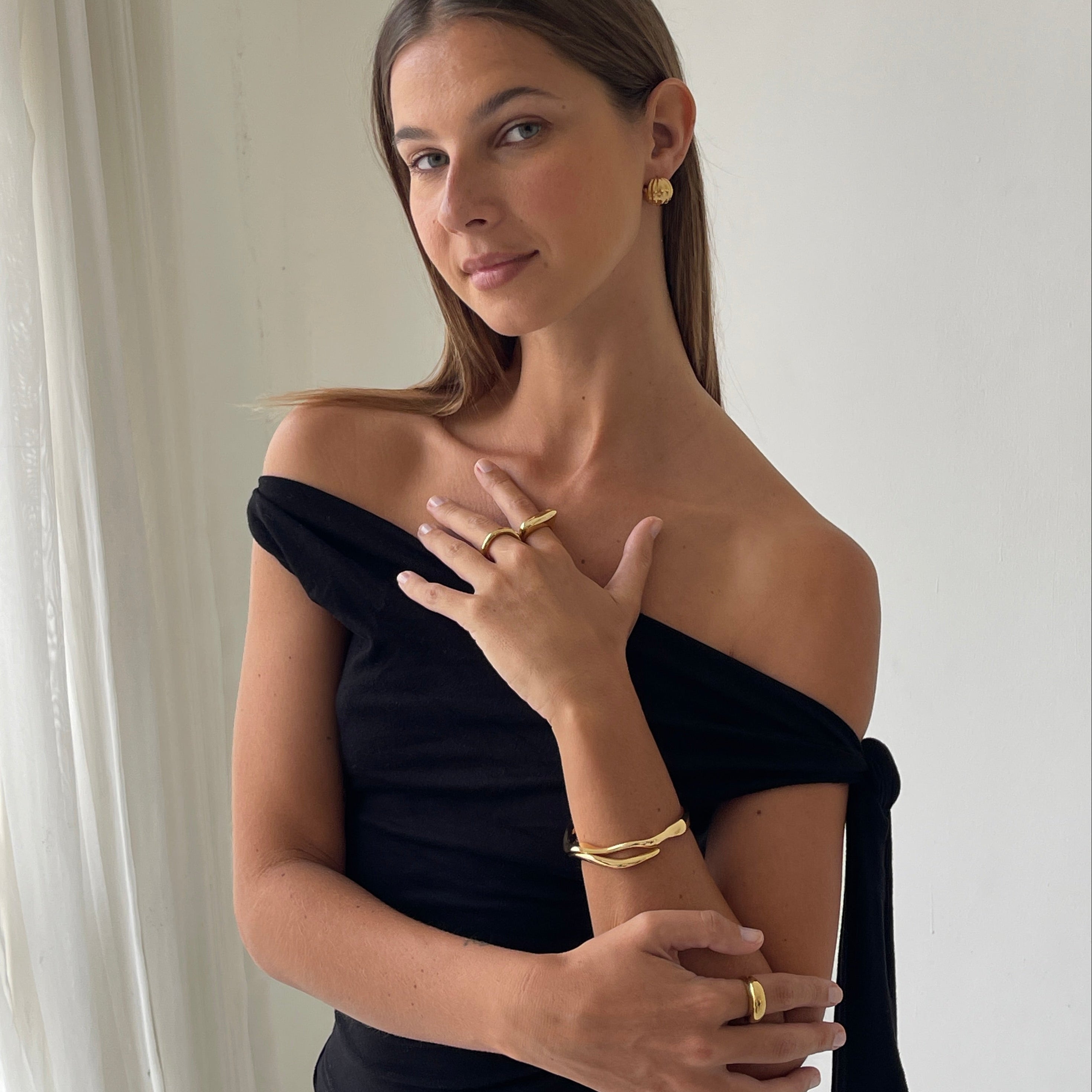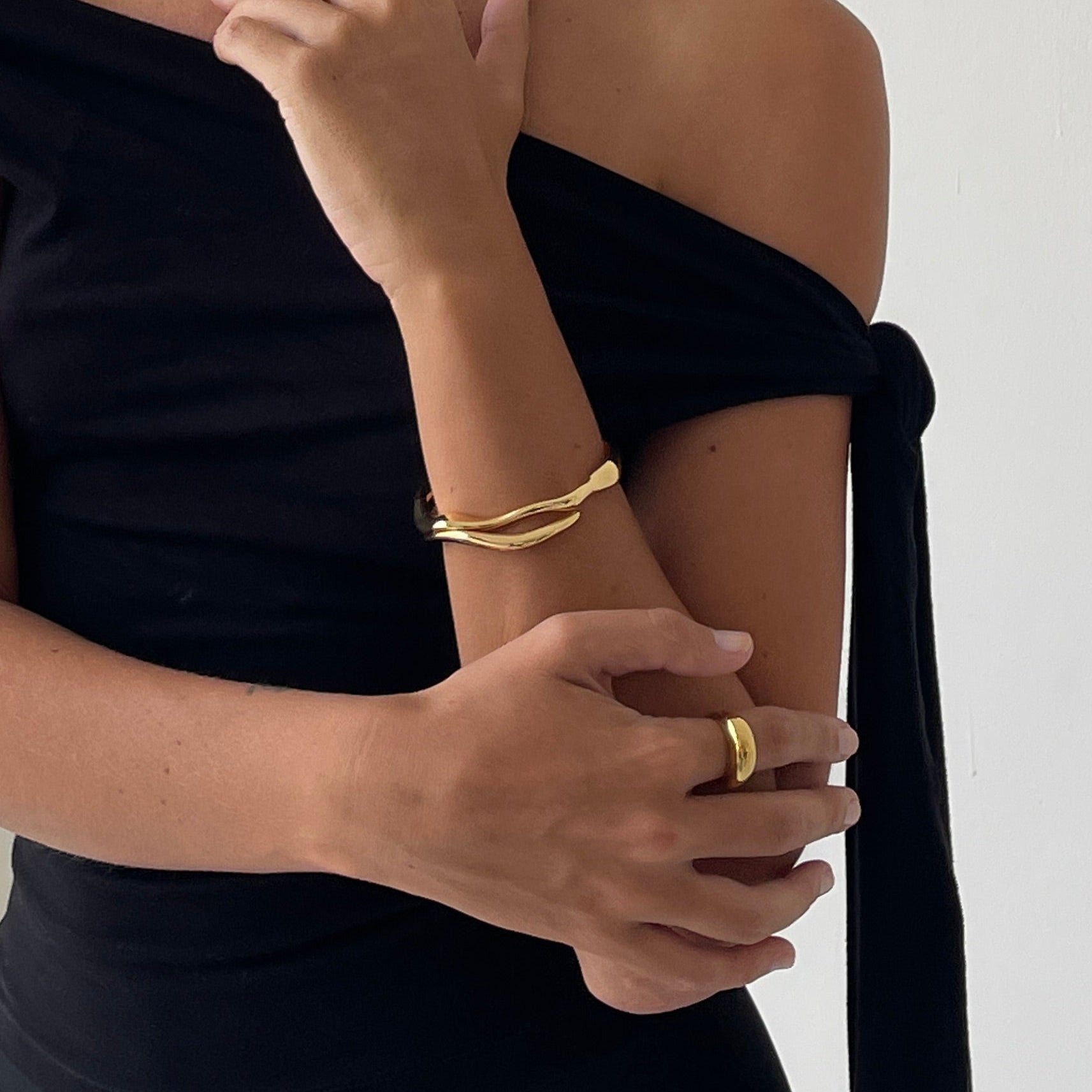 Adorn your arms with our sophisticated gold hook bracelet. Whether worn loosely or secured higher on the arm, it lends a distinctive elegance, offering a varied aesthetic with each styling choice.